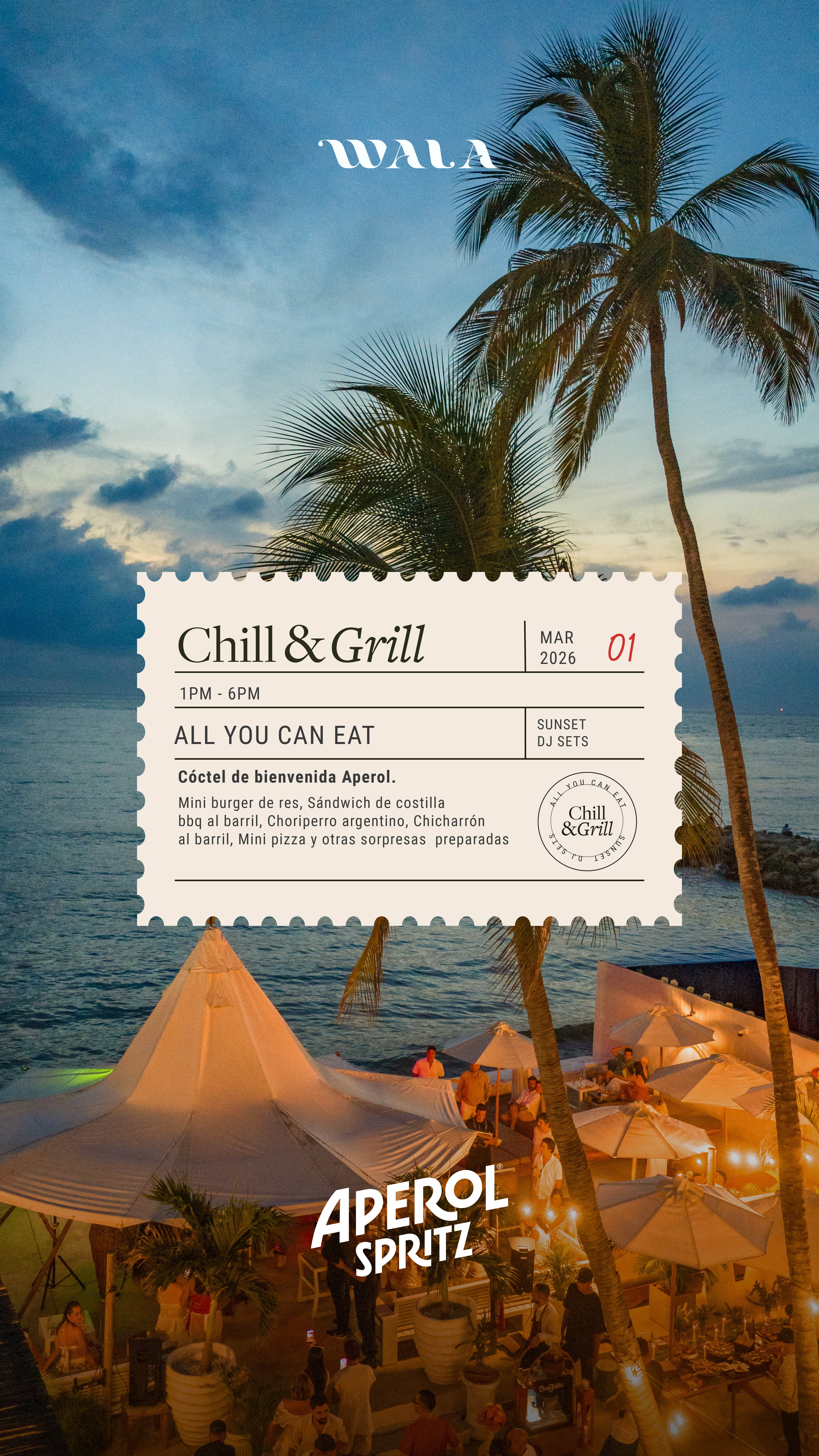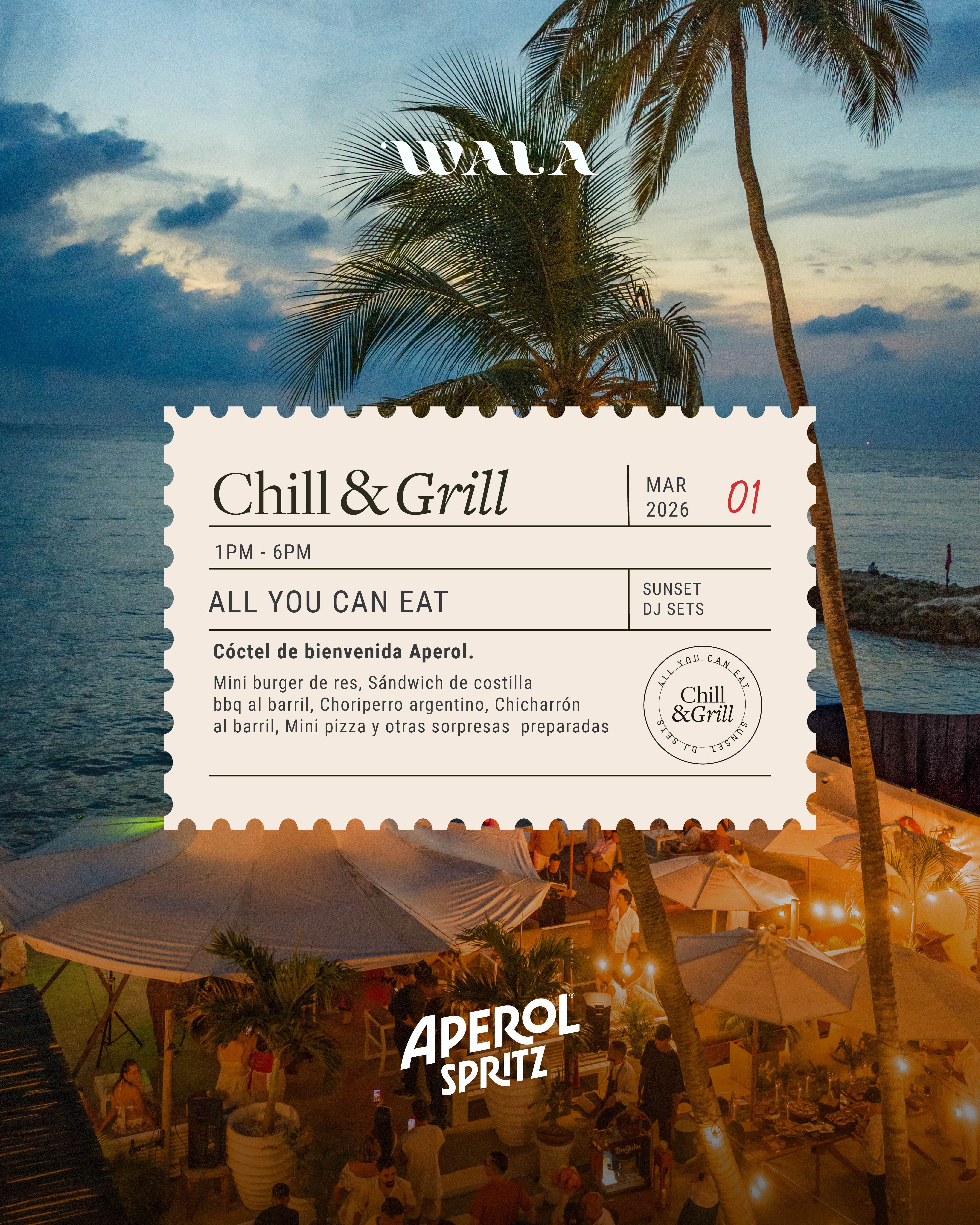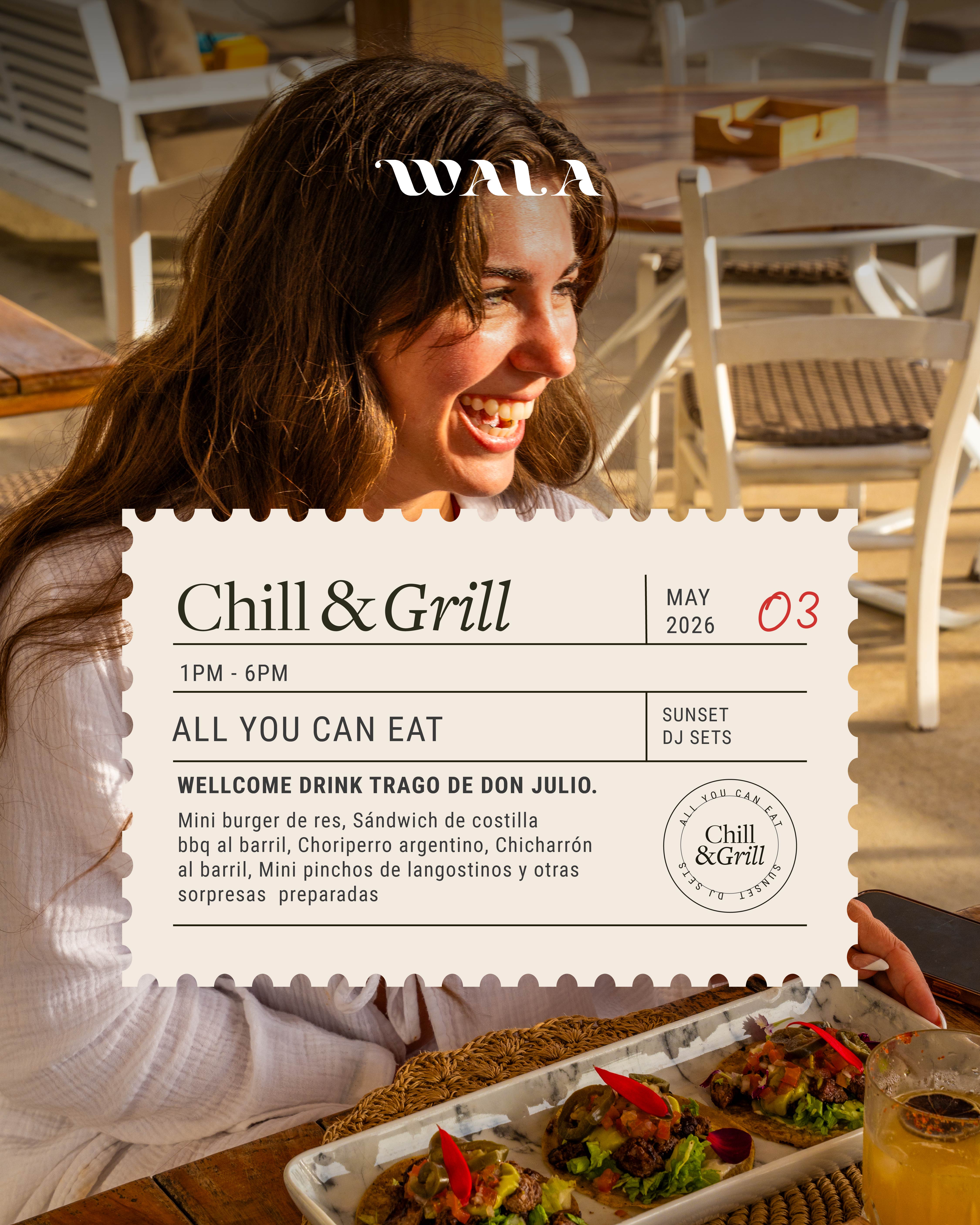 ¡Bienvenidos a Chilling and Grilling, el evento donde el sabor y la buena vibra se encuentran! Dos veces al mes, te invitamos a disfrutar de una experiencia única con temáticas personalizadas y formato All You Can Eat en cada edición.